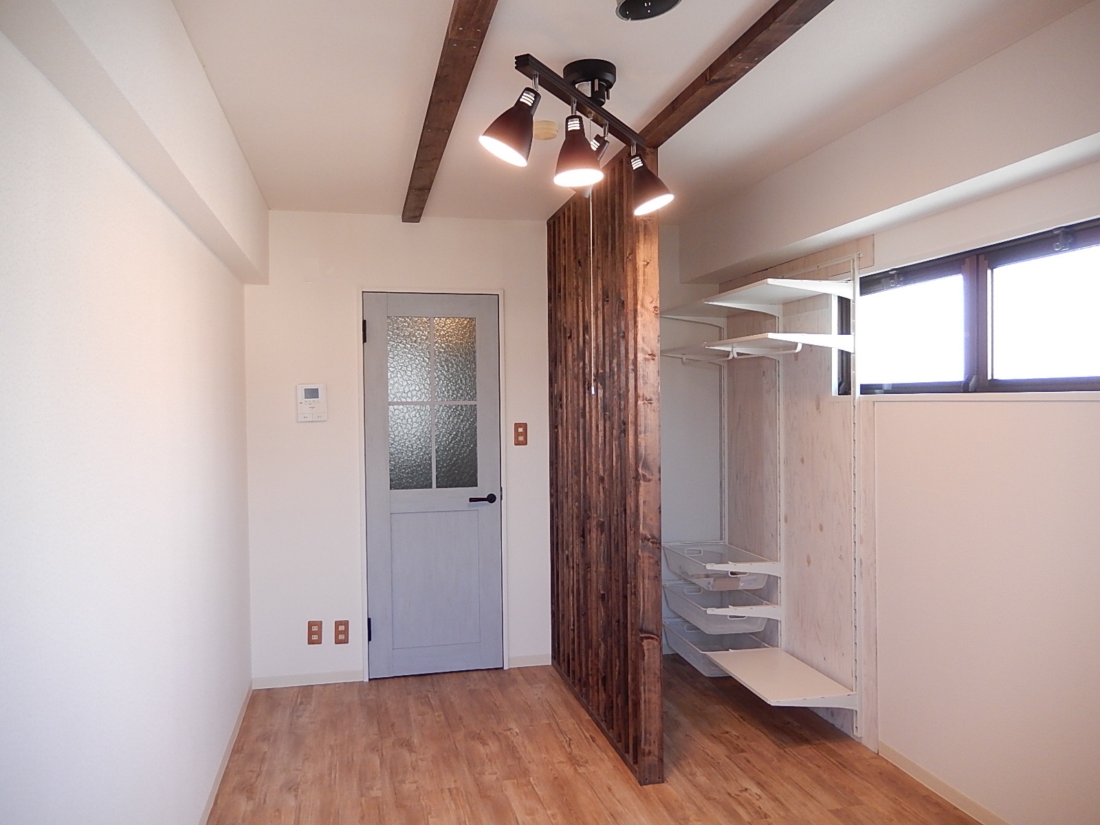 【広島市佐伯区楽々園:広工大JCD第6弾コラボ部屋】広島工業大学の女子学生さんのアイディアを形にしたコラボ部屋です☆第6弾のこのお部屋はテーマが『北欧スタイルルーム』。お部屋全体を北欧テイストで統一された、素敵なお部屋です!部屋の中にアクセントになる木の造作を設置し、裏側はなんとクローゼットに!たっぷり収納ができます☆お部屋の扉も北欧風に、オシャレなくすんだブルー♪コンセントカバーもこだわって木の雰囲気で統一しました。